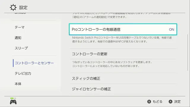 USB無線接続の際にも、Switchの設定画面で「Proコントローラーの有線通信」を「ON」にする必要があります。